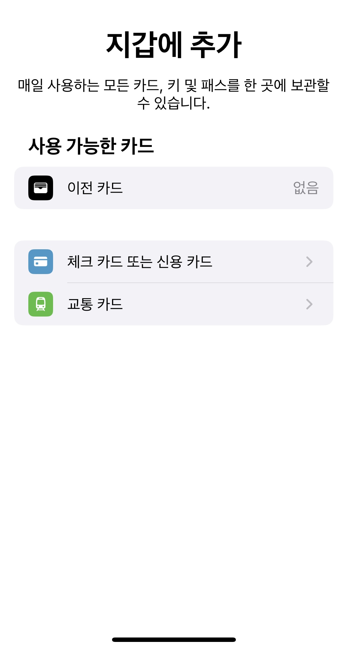 현재 애플페이 지갑에는 **선불형 티머니 카드만 추가 가능**합니다. 또한 각 지자체에서 운영하는 ‘기후동행카드’ 등 정책형 카드는 지원되지 않습니다.