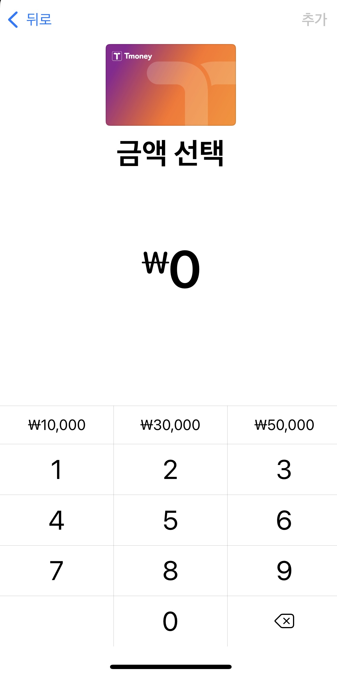 - ‘+’ 버튼 → 교통카드 추가 → Tmoney 선택